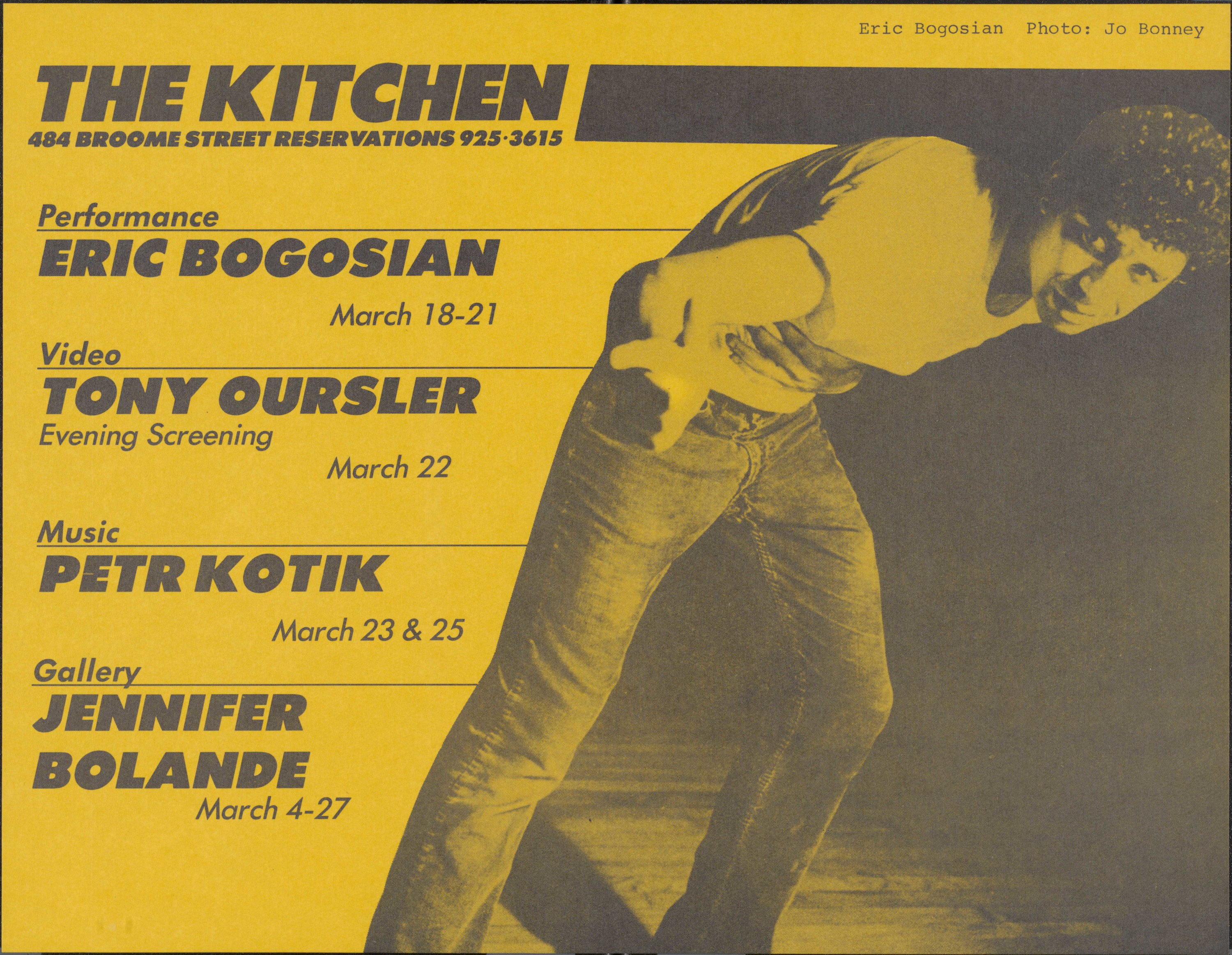 Performance: Eric Bogosian, March 18-21 Video: Tony Oursler, Evening Screening, March 22 Music: Petr Kotík, March 23 & 25 Gallery: Jennifer Bolande, March 4-27